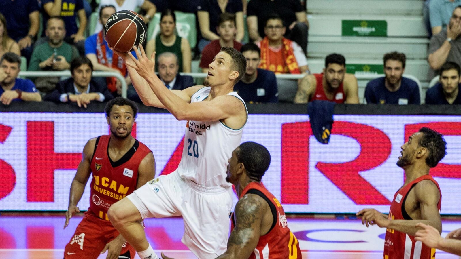 El equipo de Laso no fue capaz de aprovechar la inercia de verse arriba casi desde el comienzo y a siete minutos de la conclusión el choque estaba empatado a 51. Dos minutos después un triple de Vítor Benite ponía al UCAM CB por delante mucho tiempo después (54-53).