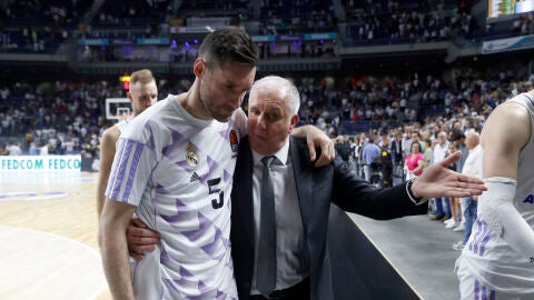 Rudy Fernández se marcha del Wizink mientras habla con Zelko Obradovic