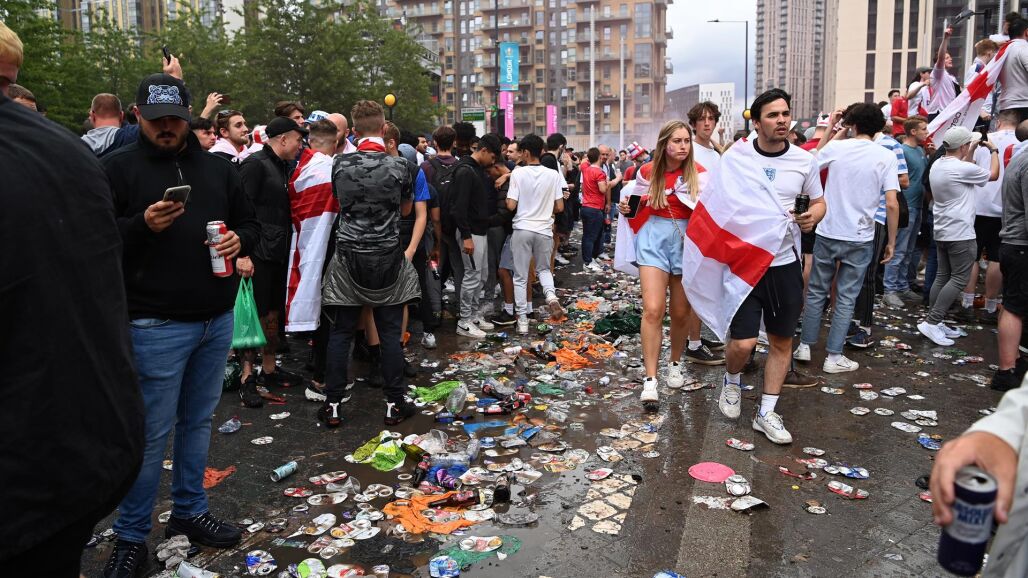 Las ganas de muchos aficionados ingleses por ganar la Eurocopa, que sería la primera de la selección inglesa ha terminado con graves incidentes en la ciudad de Londres. En la ciudad se han visto imágenes de un macrobotellón donde han volado pelotas de fútbol, botellas y cervezas. Numerosas personas han subido imágenes a las redes sociales donde se pueden ver las calles de Londres repletas de aficionados y llenas de suciedad.
