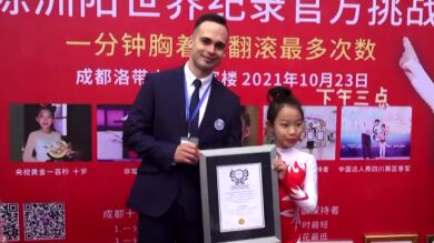 El tercer desafío consiste en dar 20 volteretas hacia delante con el pecho en el suelo. Chen Zhouyang logra un nuevo récord de 11,98 segundos.