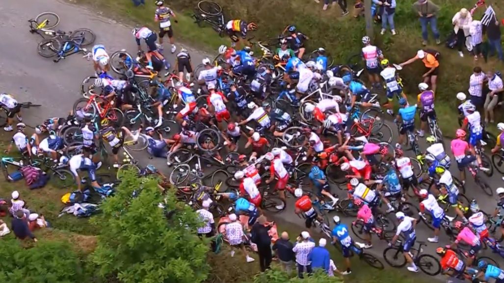 Tony Martin fue el primer ciclista que cayó al suelo después de impactar con la pancarta de un espectador que ocupaba parte de la calzada. A partir de ahí cayeron decenas de ciclistas en el pelotón formando un tremendo caos.