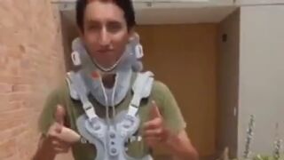 18 días después de su grave accidente, Egan Bernal ha reaparecido caminando. Con corsé y collarín, pero sonriendo y dando las gracias a su fisio, Cristian Alonso. Verle caminar impresiona.