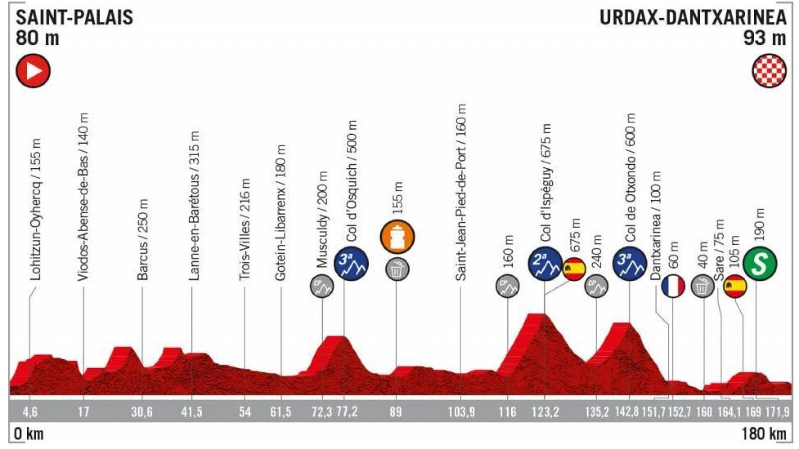 Dos puertos de tercera categoría (C'ol d'Osquich y Col de Otxondo) y un alto de segunda (Col d'lspéguy) jalonan esta etpapa.