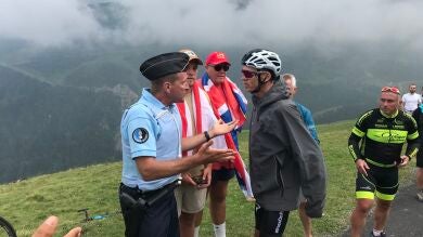 Un gendarme confundió a Chris Froome con un aficionado y le derribó cuando el ciclista descendía hacia su autobús. El británico se cayó de la bicicleta y se encaró con el agente, pero el problema no pasó a mayores.