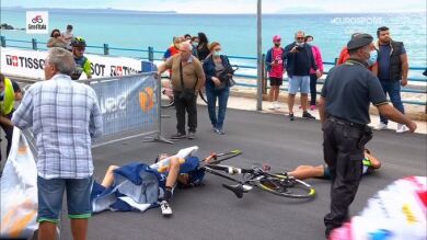 El helicóptero provoca una espeluznante caída en el final de la cuarta etapa del Giro de Italia