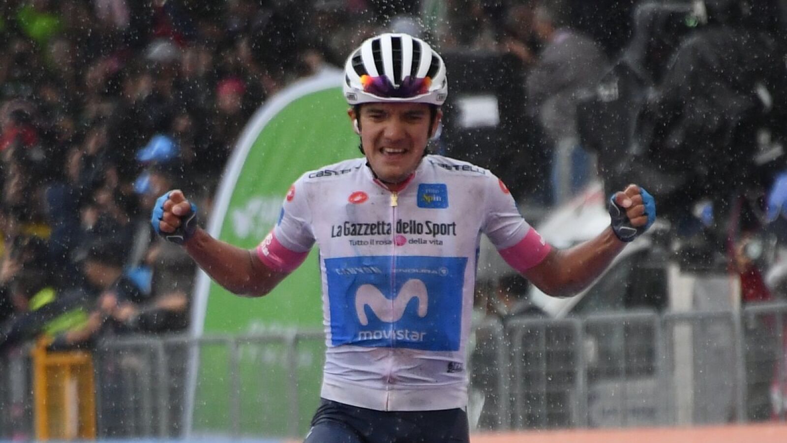 Primera victoria ecuatoriana en la historia de la carrera rosa y estreno en el World Tour para el ciclista del Movistar unos días después de imponerse en la Vuelta a Asturias. Un éxito saboreado en la recta de meta. Golpes en el pecho, emoción y foto para el recuerdo.