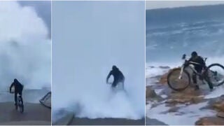 La tremenda imprudencia de un ciclista que se mete en una ola en Punta Herminia con su bicicleta