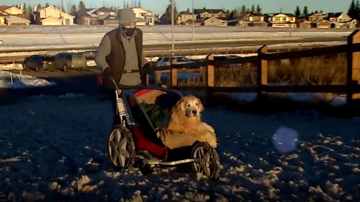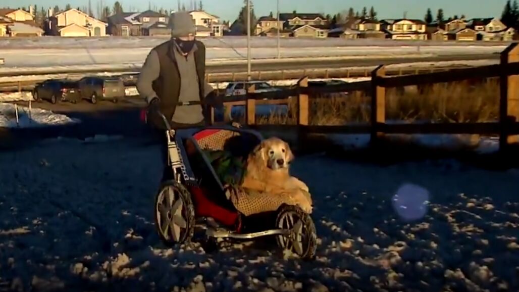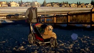 Donny Marchuk es un atleta que ha participado tres veces en la maratón de Boston y desde hace tiempo siempre que se va de excursión lo hace con su perro Sully. Este Golden retriever de más de 14 años apenas puede andar pero ayudado de una silla especial nunca acompaña a su amo por las diferentes montañas de Canadá.