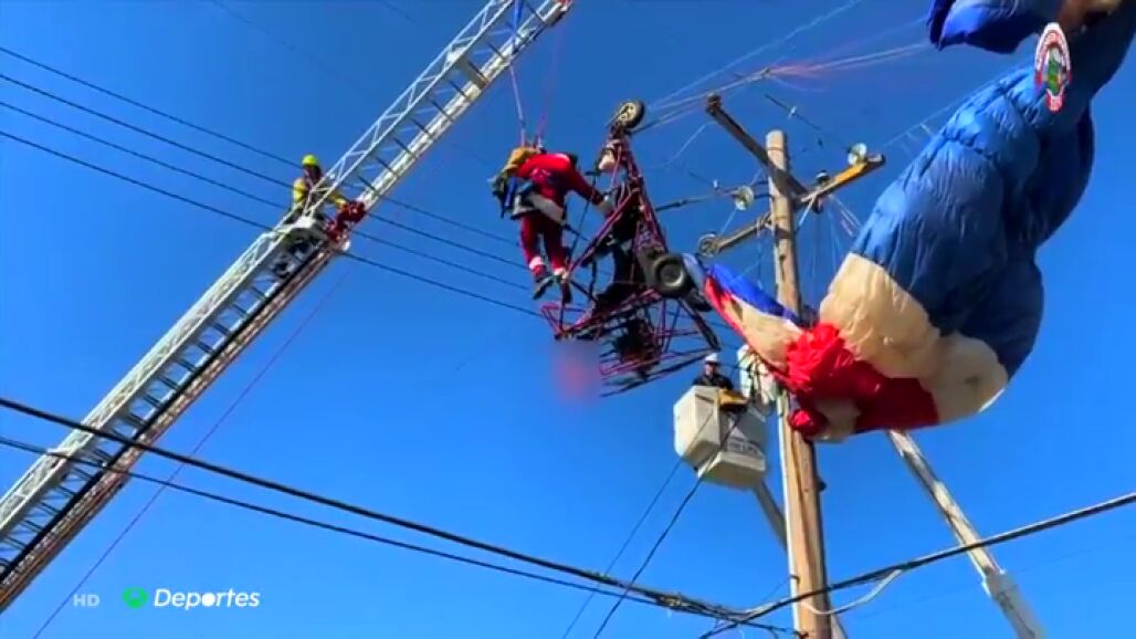 El operativo de los sufridos bomberos salvó a este Papá Noel de un final que podía haber sido trágico. Una gigantesca escalera haciendo de grúa acabó descolgando al piloto de su trineo.