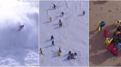 El primer campeonato del mundo de surf tow-in celebrado en la Praia do Norte (Nazaré) ha dejado una secuencia esaclofriante cuando el jet-ski, pilotado por Hugo Vau, trataba de sacar al surfista Alex Botelho de una serie de olas en la que había quedado atrapado.