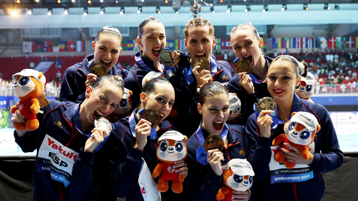 La natación artística española cerró su actuación en los Mundiales de Singapur con un total de nueve medallas, tras colgarse este viernes el bronce en la final de la rutina acrobática por equipos con una nota de 221,0962 puntos. El conjunto español, integrado por Cristina Arámbula, Txell Ferré, Marina García, Dennis González, Lilou Lluis, Txell Mas, Paula Ramírez y Sara Saldaña, se quedó a 7,9224 unidades de China, que encadenó su tercer título universal consecutivo con una puntuación de 229,0186. Completo el podio el equipo ruso, que compite en estos campeonatos bajo bandera neutral y que logró la medalla de plata con un total de 224,721 puntos, tres más que España.