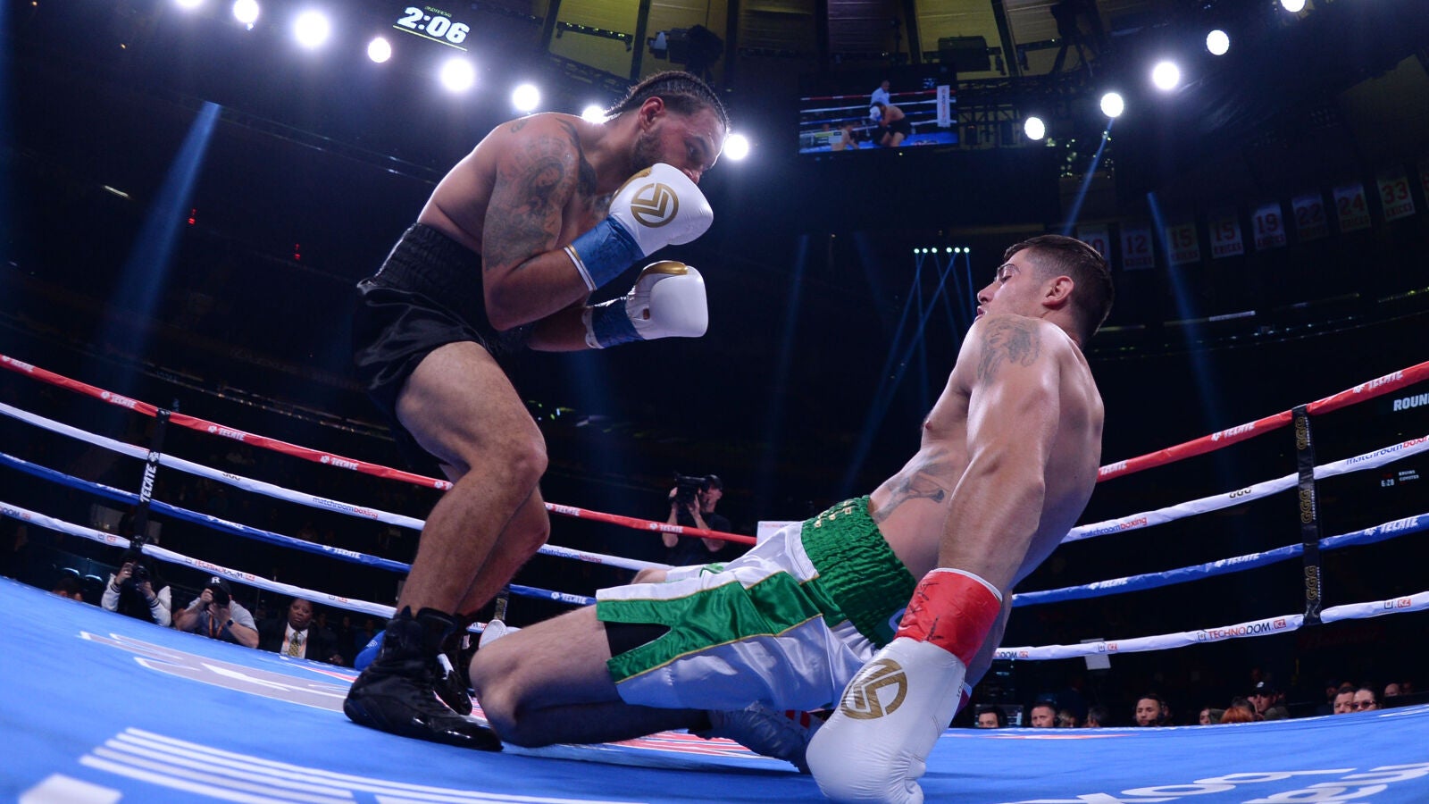 Joe Ward retrocedió para evitar un golpe en su pugna con Delgado y terminó dislocándose la rótula izquierda y cayendo en la lona. Un médico le colocó la rodilla sobre el ring, pero Ward tenía poco que hacer ya: perdió por K.O. técnico.