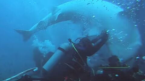 Estas imágenes se han vuelto a hacer viral en un foro de Reddit. El tiburón tigre, conocido por su apodo 'Big Mama', además consigue morderle la cabeza a uno de los buzos antes de que sus compañeros pudieran deshacerse del escualo.