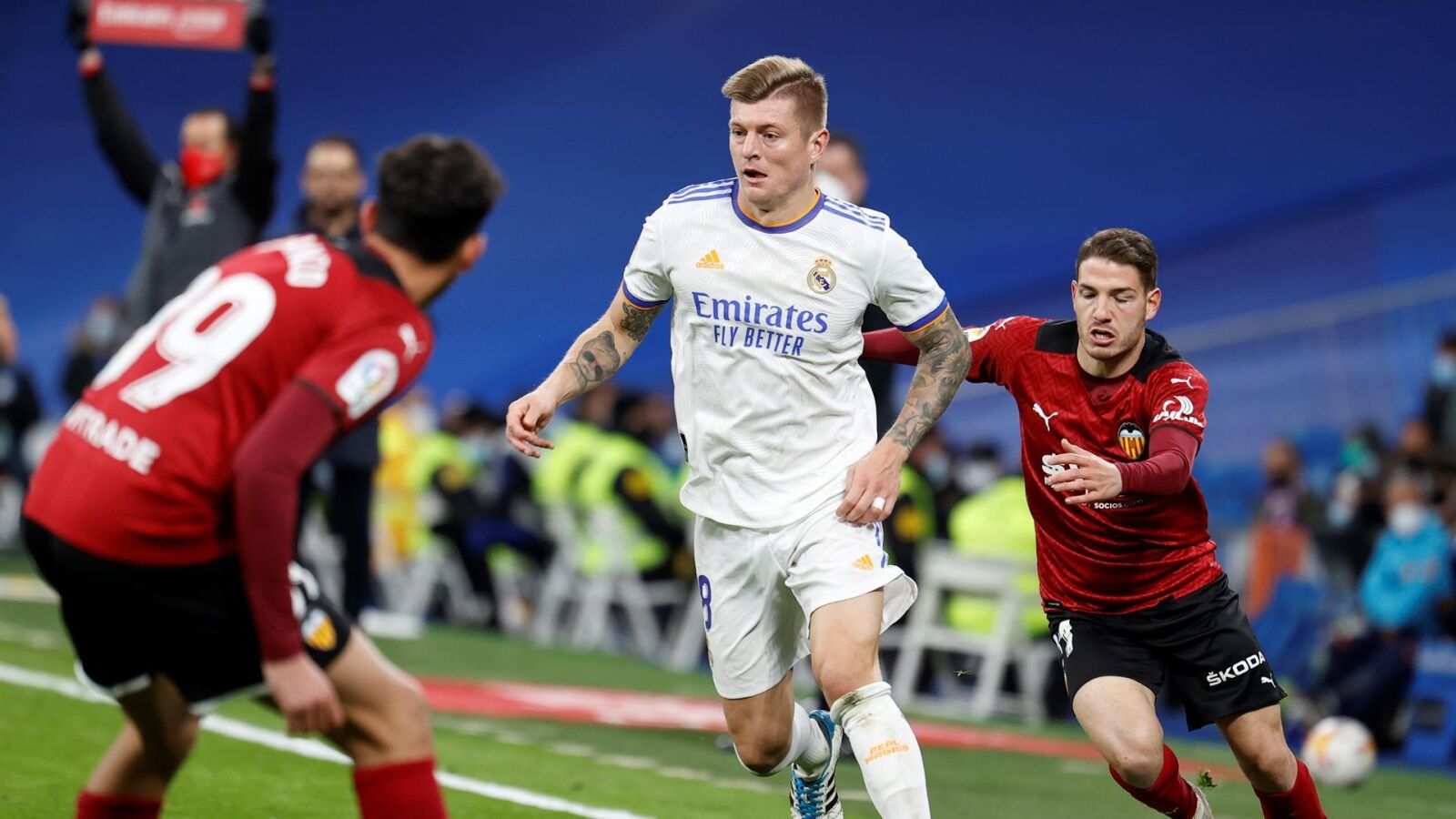 Kroos también ha señalado que la posible llegada de Kylian Mbappé y Erling Haaland al Real Madrid no es un tema de conversación en la plantilla del equipo blanco: "Llevo ocho años aquí y siempre se ha hablado de jugadores que luego no vienen nunca. Claro que se trata de dos jugadores de los que se habla por su situación contractual y porque son los nombres más interesantes que están en el mercado", subrayó.