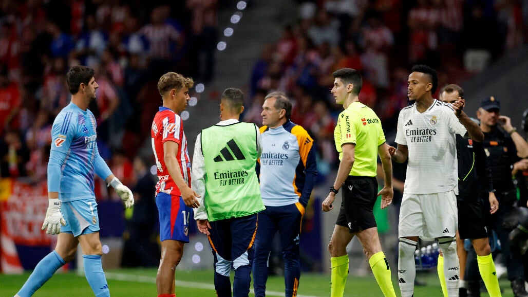 Esto es lo que señala el acta arbitral de Mateo Busquets Ferrer sobre el lanzamiento de objetos a Courtois y la suspensión del derbi en el Metropolitano durante 17 minutos. El Atlético se enfrenta a un cierre parcial del Metropolitano.
