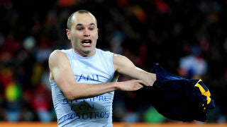 Iniesta también contó cómo se le ocurrió ponerse la camiseta con la dedicatoria al fallecido Dani Jarque: "Se me ocurrió antes de empezar el calentamiento. Me vino una señal a la cabeza y se lo dije al preparador, y me la puse antes de empezar el partido", cuenta. Este 11 de julio se cumple una década de la mayor hazaña del fútbol español cuyo gran protagonista fue el jugador de Fuentealbilla con ese gol que nos hizo campeones.