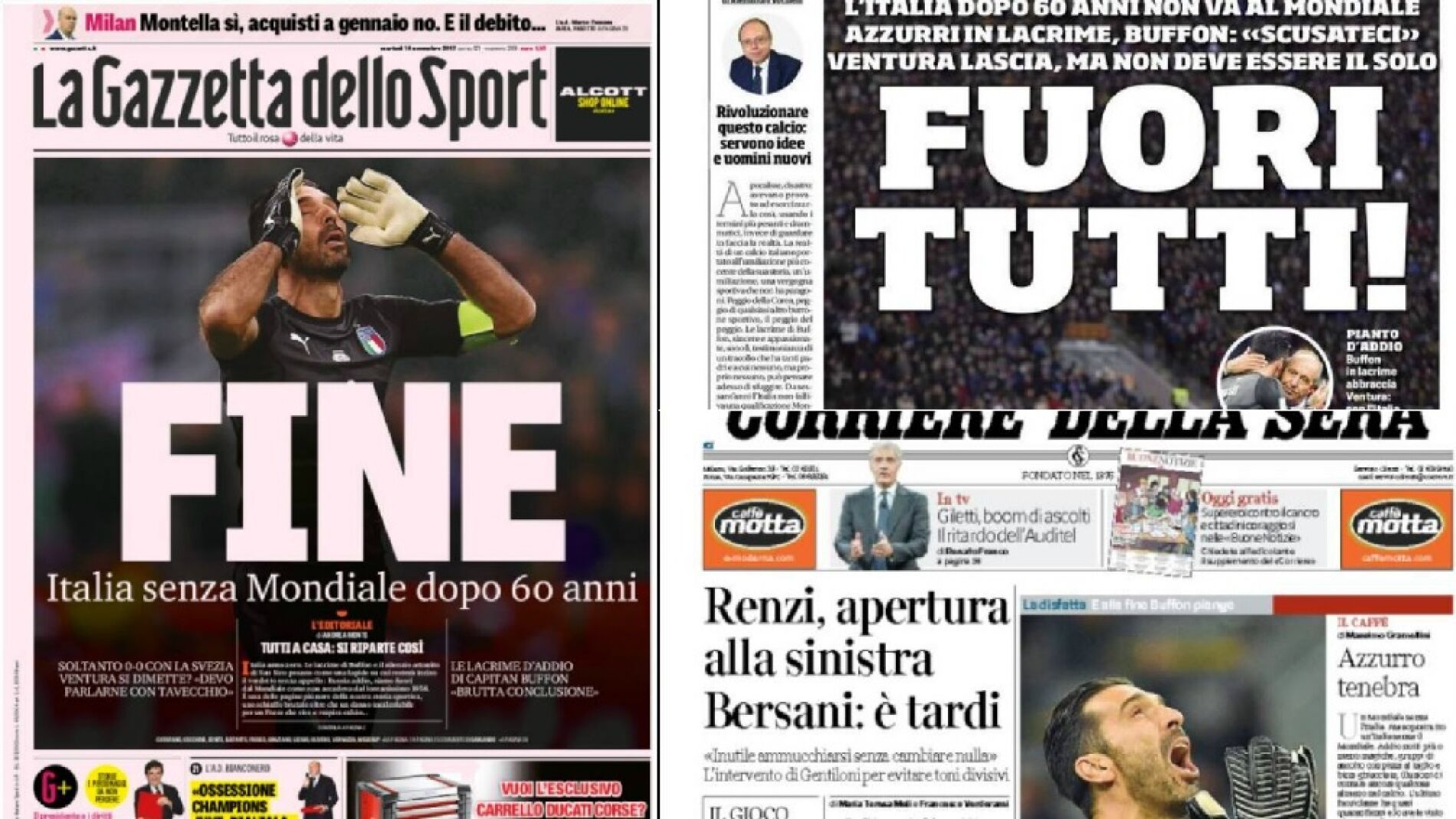Ambos periódicos salen con unas fotos de Buffon en sus respectivas portadas y "La Repubblica" es el más duro con la FIGC y el técnico Ventura, al destacar que "no hay excusas" que justifiquen esta "catástrofe".