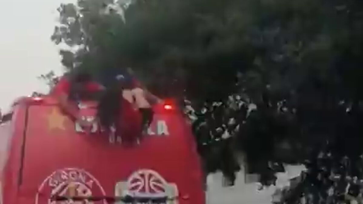 En las imágenes se puede ver como los jugadores, que iban en la parte descapotable del autobús, se agachan para evitar el impacto con las ramas, pero una fotógrafa del club no se percata del peligro.