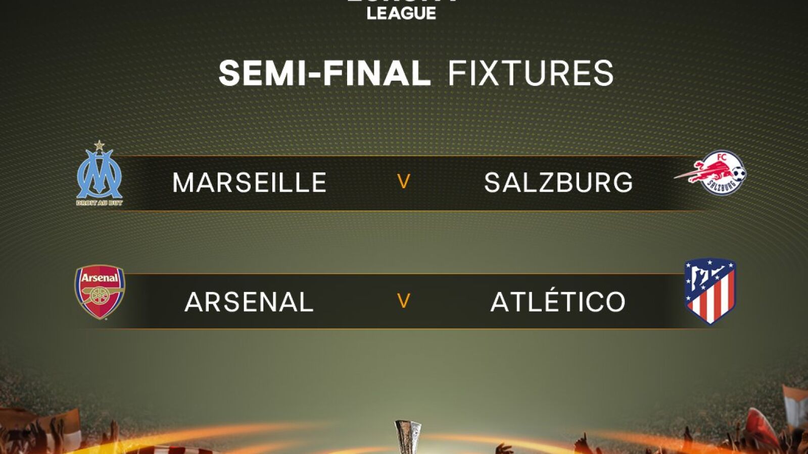 Arsenal - Atlético de Madrid y Marsella - Salzburgo. Esas son las semifinales que ha deparado el sorteo de la Europa League. La ida de estos cruces se jugará el 26 de abril, mientras que la vuelta será el 3 de mayo.