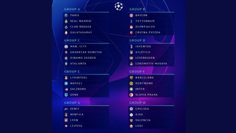 Así quedan configurados los 8 grupos de la fase de grupos de Champions League 2019-20 tras el sorteo de Champions. Real Madrid, Barça, Atlético de Madrid y Valencia ya conocen a sus rivales. | Sorteo Europa League en directo online