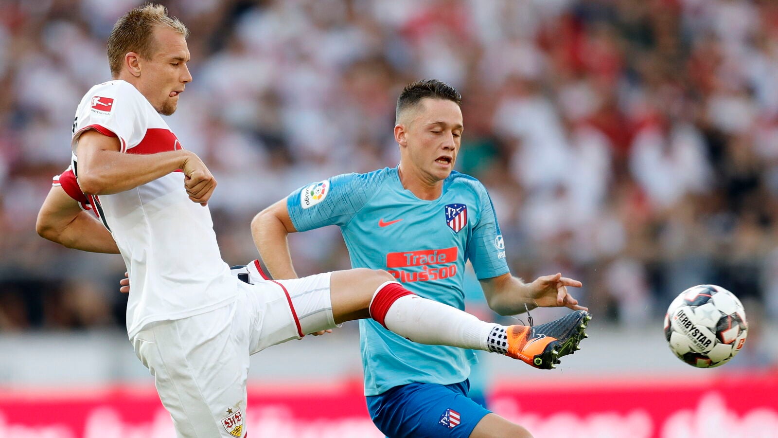Con ello, al descanso se llegó sin goles. La segunda mitad, ya sin Lemar, Gelson, Saúl, Kove ni Juanfran, contó prácticamente de salida con un notable disparo de Correa bien resuelto por el meta local, pero sobretodo con la sorpresa de ver como el Stuttgart se adelantaba en el marcador.