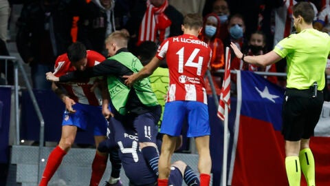 Primer atisbo de lo que podría haber sido un lío defensivo. Cayó Correa en el área y pedían penalti en el Atlético de Madrid. El árbitro estaba cerca y dijo que no hubo nada.