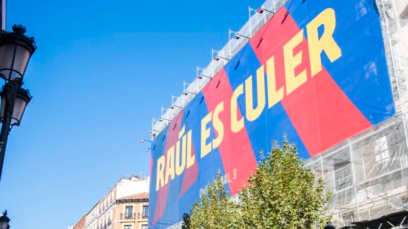 El cartel de la polémica reza el siguiente mensaje: 'Raúl es culer', el escudo de la entidad y la dirección de la nueva tienda en Madrid. En las cristaleras de los escaparates hay otros dos carteles con los lemas 'Iker es culer' y 'Guti es culer'.