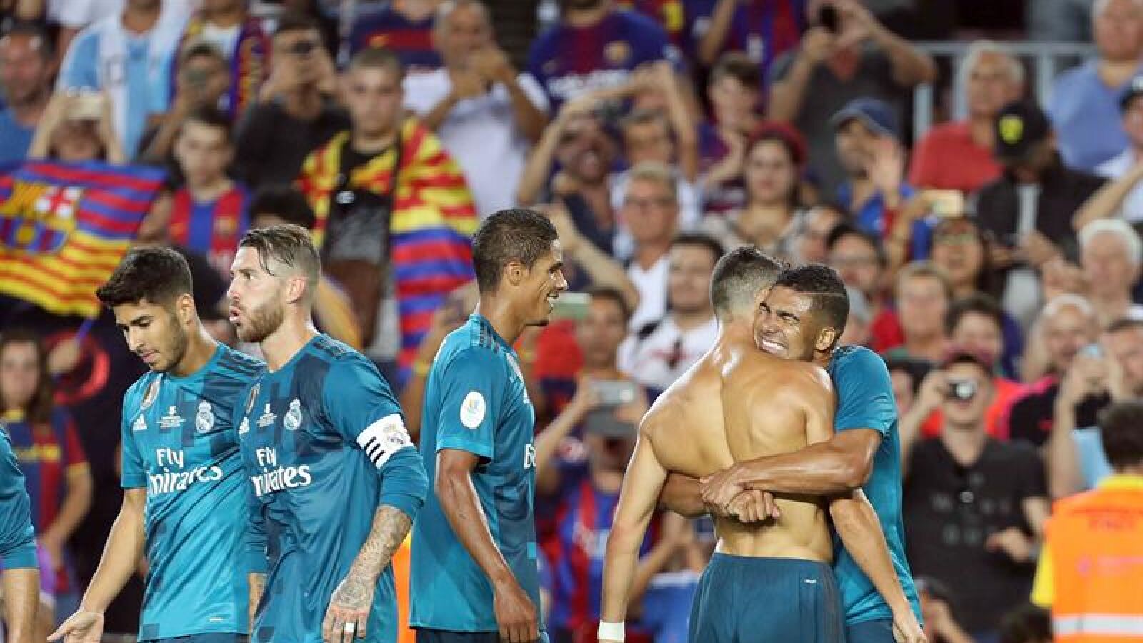 La ida de la Supercopa de España en el Camp Nou estuvo marcada por la polémica arbitral y por los golazos de Cristiano Ronaldo y Marco Asensio. Cristiano fue protagonista al anotar un auténtico golazo y ser expulsado minutos después por fingir a juicio del colegiado una caída ante Umtiti. El Real Madrid se adelantó con un gol de Piqué en propia puerta y Messi empató de forma provisional para el Barcelona tras un discutible penalti de Keylor Navas a Luis Suárez. Marco Asensio sentencio el partido y media Supercopa con un disparo a la escuadra en el minuto 90.