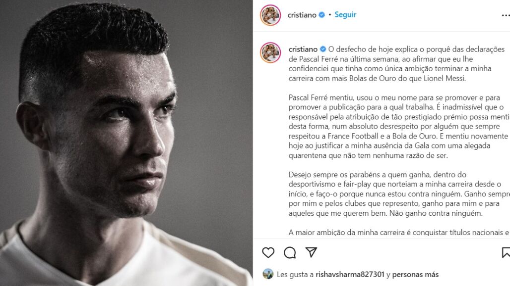 Cristiano estalla ante las críticas por su ausencia en la gala del Balón de Oro y la afirmación de Pascal Ferré, redactor jefe de France Football: "No gano contra nadie", señaló el portugués en Instagram.