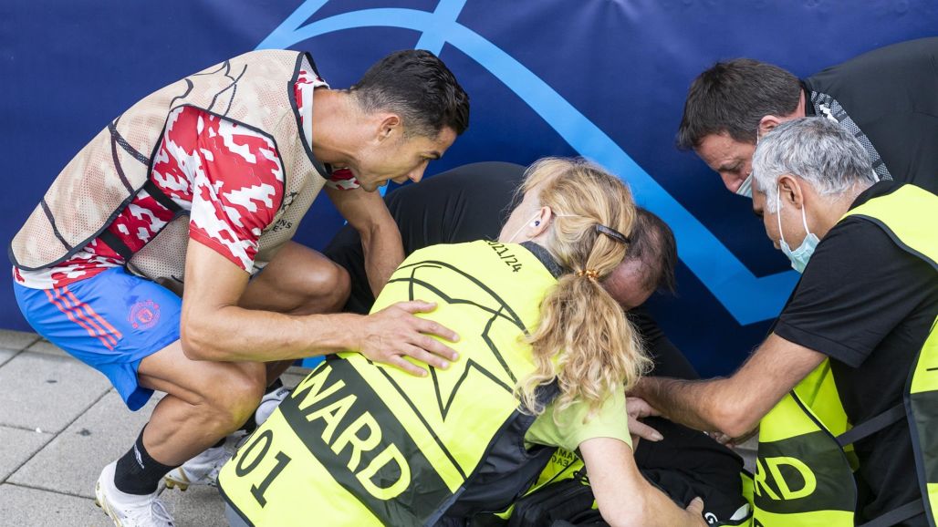 Cristiano Ronaldo no dudó en ayudar después de que un fuerte pelotazo golpeara por accidente a un miembro del equipo de seguridad. La mujer alcanzada por el balonazo se desplomó sobre el césped en los prolegómenos del choque entre el Manchester United contra el Young Boys en la Champions League.