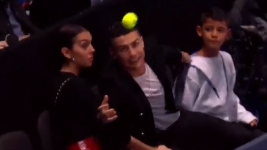 Cristiano Ronaldo acudió a Londres para ver el Djokovic - Isner de la Copa Masters junto a Georgina y Cristiano Jr. Una de las bolas fue hacia el sitio donde se encontraban y el portugués intentó cazarla.