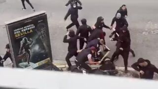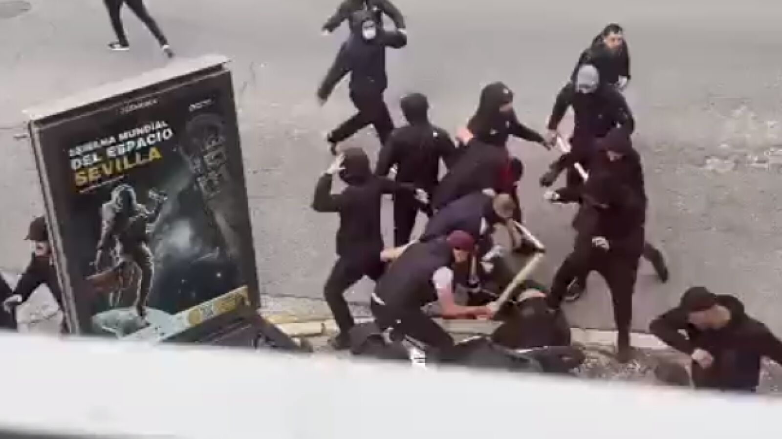 Los alrededores del Benito Villamarín vivieron también una escena tan escalofriante en la previa del Betis-Osasuna. Un grupo de ultras de bando desconocido apaliza salvajemente a un hombre hasta dejarle inconsciente en el suelo. Los agresores se ensañan con patadas y barras, asestándole golpes incluso una vez quieto.
