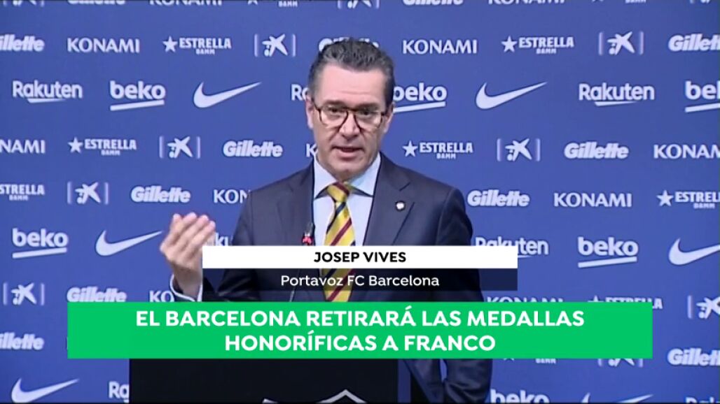 La junta directiva del Barcelona ha acordado dejar sin efecto las distinciones otorgadas al general Francisco Franco en 1971 y 1974 y todos los efectos honoríficos vinculados a su entrega, un acuerdo que tendrá que ser ratificado por los socios en la próxima asamblea de compromisarios. Así lo anunció el portavoz de la entidad, Josep Vives.