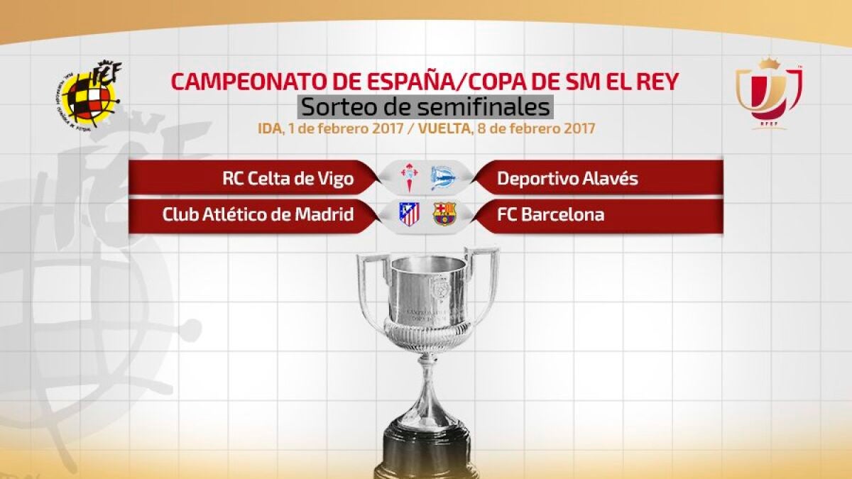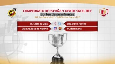 Celta de Vigo-Deportivo Alavés y Atlético de Madrid-Barcelona son los emparejamientos de semifinales de la Copa del Rey, según el sorteo celebrado este viernes en la Ciudad del Fútbol de Las Rozas. El Barcelona, vigente campeón de Copa, ha accedido a las semifinales tras eliminar al Hércules, Athletic Club de Bilbao y Real Sociedad.
