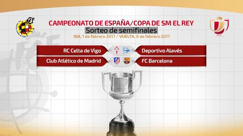El Atlético de Madrid y el FC Barcelona abrirán el miércoles 1 de febrero los partidos de ida de semifinales de Copa del Rey, y afrontarán la vuelta el martes 7, mientras que Celta y Alavés se enfrentarán el jueves 2 de febrero, en la ida, y el miércoles 8, en la vuelta.