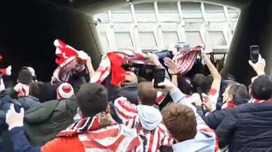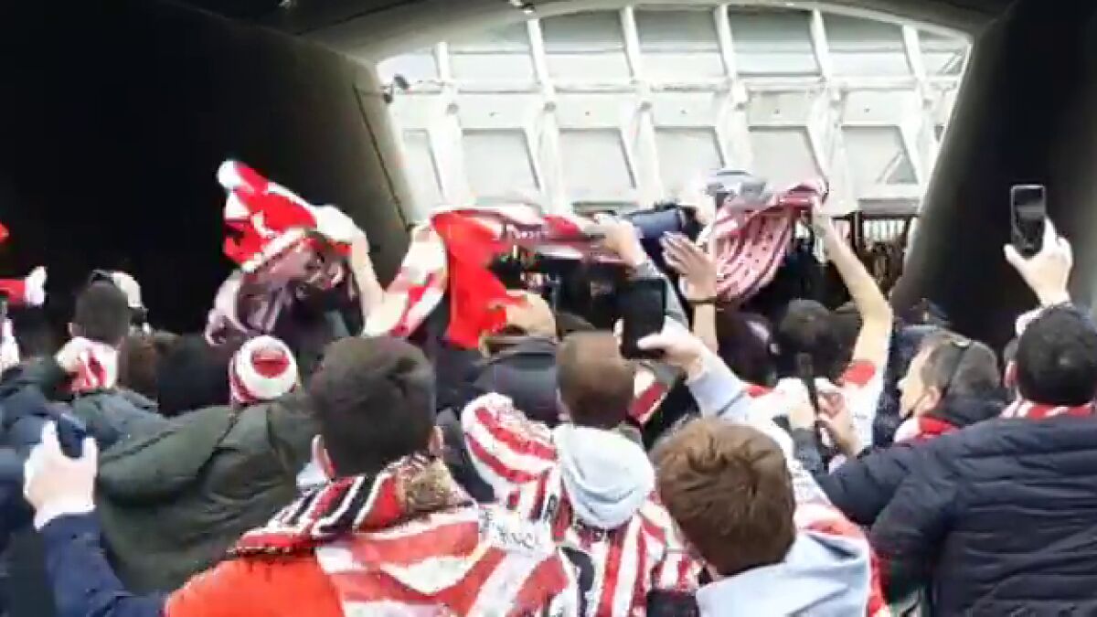 El espectacular recibimiento de la afición del Athletic a los jugadores a la llegada a Bilbao