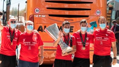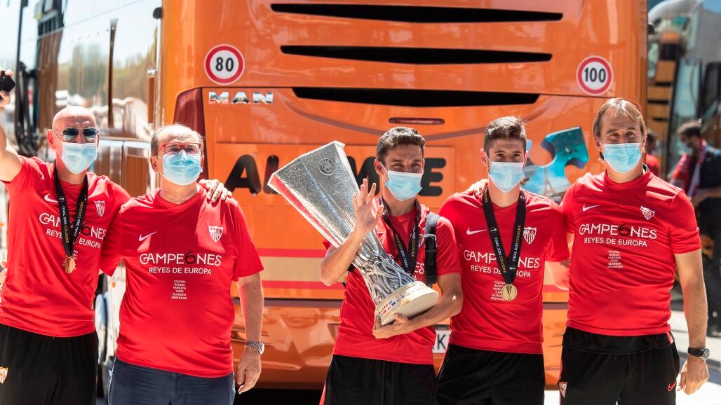 La delegación sevillista fue recogida por autobuses en el aeródromo de San Pablo pero antes hubo tiempo para que jugadores, técnicos y dirigentes se dejaran fotografiar con el trofeo previo a desplazarse hacia la ciudad deportiva del club, donde acaba este primer trayecto.