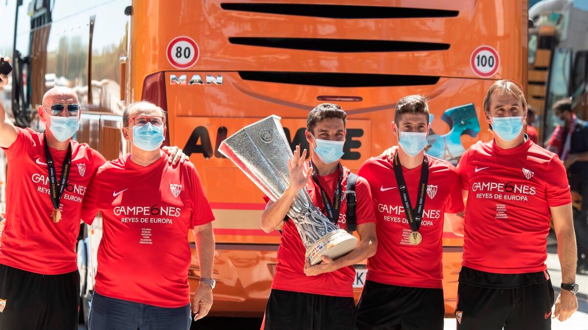 La expedición del Sevilla ya está en casa, procedente de Alemania, donde anoche conquistó en Colonia ante el Inter su sexta Europa League.