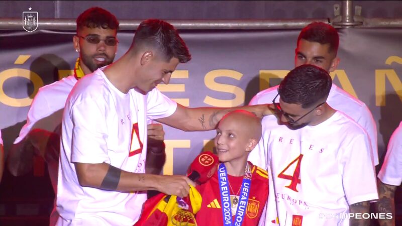 Álvaro Morata dedicó unas emocionantes palabras a la pequeña: "Nos alegra mucho tenerte aquí con todos nosotros, tú nos enseñas cada día lo que es luchar de verdad en la vida y lo que es ser un superhéroe de verdad en la vida". Después, el capitán de la Roja le invitó a levantar la copa al cielo de Madrid y todo el equipo acabó vitoreándola: "¡Campeona, campeona, campeona!".