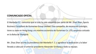 Zhao Zhen asume la presidencia del Marbella y "agradece la dedicación y la labor llevada a cabo por el anterior presidente Alexander Grinberg y todo su equipo". El comunicado destaca que el Marbella "inicia una nueva etapa cuyo objetivo prioritario es su crecimiento en todos los ámbitos, desde un ejercicio de responsabilidad, compromiso e ilusión" para que los aficionados "se sientan orgullosos" y el club "esté a la altura de lo que representa" para la ciudad.