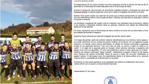 "Durante el transcurso del encuentro se escucharon múltiples insultos y amenazas a nuestros jugadores. Nuestro club quiere acabar con este tipo de actos que se llevan produciendo en cada ocasión que nos enfrentamos ante el Club Europa de Nava. Creemos que este tipo de actitudes y hechos no ayudan al deporte", ha publicado el Independiente CF de Lieres.