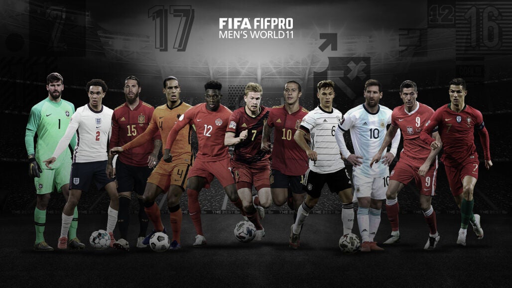 Este es el FIFA FIFPro World XI: Alisson; Alexander-Arnold, Van Dijk, Sergio Ramos, Davies; Kimmich, De Bruyne, Thiago Alcántara; Messi, Lewandowski y Cristiano Ronaldo.