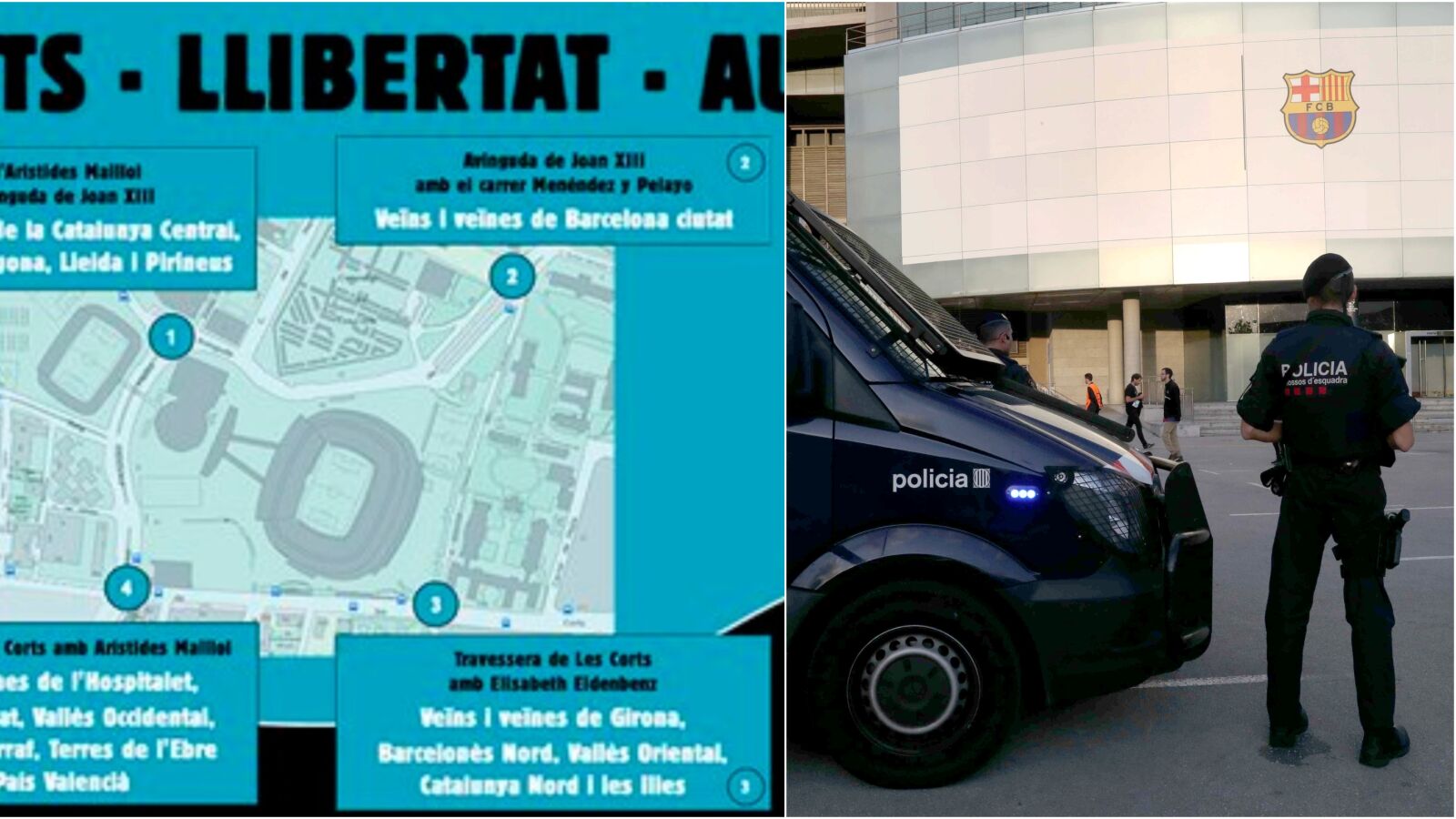 La Avenida Juan 23 a la altura de la Masía, la Avenida Juan 23 con Arístides Maillol (donde estaba el Mini Estadio), Aristides Maillol con Travessera de les Corts, y Travesera de les Corts con la calle Elisabeth Eidenbenz. Esos son los cuatro puntos fijados por Tsunami Democràtic para tratar de boicotear el Clásico entre Barcelona y Real Madrid el próximo 18 de diciembre.