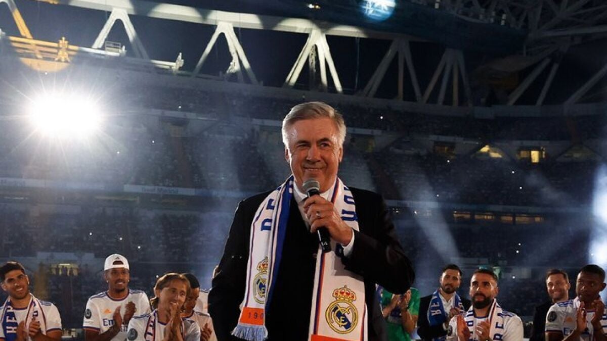 La celebración del Real Madrid en el Santiago Bernabéu ha tenido su punto culminante con Carlo Ancelotti volviendo a entonar el himno del club blanco y agradeciendo a la hinchada merengue su apoyo esta temporada: "Menudas remontadas en este estadio, lo hemos pasado bien. Nosotros somos madridistas, como vosotros", ha dicho el entrenador micrófono en mano.