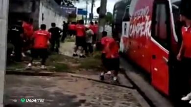 Entonces los jugadores piden parar. Se bajan y cogen piedras para responder al ataque de sus aficionados radicales. Una imagen insólita en las calles de esa ciudad brasileña. Futbolistas y ultras del mismo equipo, enfrentándose a pedradas.