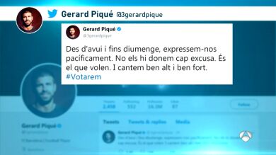 "Desde hoy y hasta el domingo, expresémonos pacíficamente. No les demos ninguna excusa. Es lo que quieren. Y cantemos bien alto y bien fuerte", escribió en catalán Piqué en su perfil oficial de 'Twitter', acompañando el mensaje con el 'hashtag' #Votarem (Votaremos).