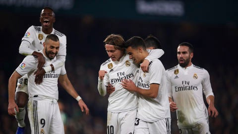 El croata Luka Modric, con un gol a los trece minutos, puso en ventaja al Real Madrid (1-0) al descanso de este partido en el estadio Benito Villamarín, de la decimonovena y última jornada de la primera vuelta de LaLiga.