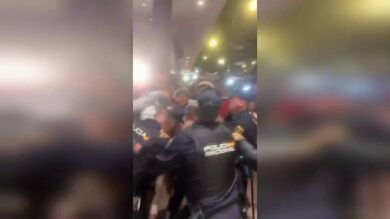 En ese momento, los agentes de la Unidad de Intervención Policial (UIP), más conocidos como antidisturbios, les indicaron que debían retroceder hacia la puerta del hotel, lo que desató los empujones y manotazos entre policías, integrantes de la expedición peruana y aficionados.