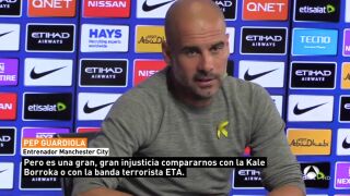 Pep Guardiola destacó que, en contra de lo que se dice, todos los mensajes han sido pacíficos y no se ha generado violencia. El técnico del Manchester Cityasegura que es una injusticia que se les compare con ETA o la 'kale borroka'.