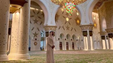 El camero aparece con el traje típico árabe llamada Candura. Esta impresionante mezquita se ha convertido en el epicentro del emirato.